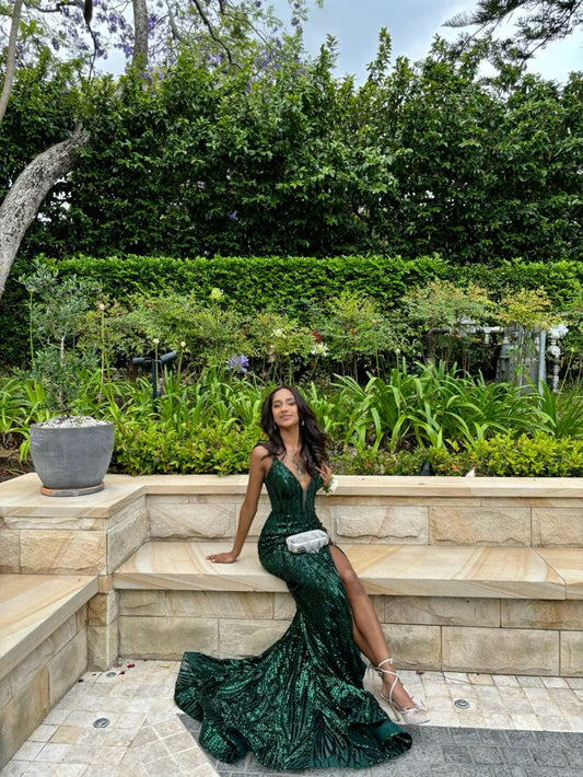 Green V-neck shiny fashion long sequins elegant mermaid slim fit formal floor-length prom dress evening gown party dress nv3474