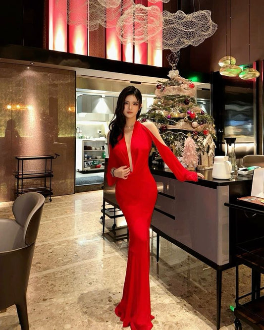 Red long sleeve fashion off-shoulder elegant sexy long mermaid slim ball gown evening dress prom dress nv3231