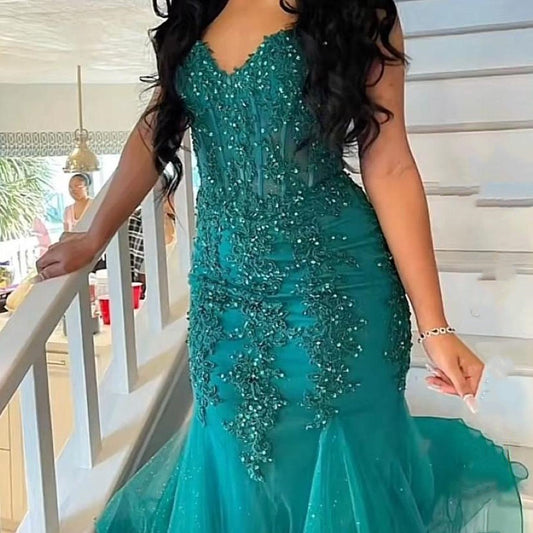 Green elegant exquisite applique beading long tulle ball gown evening dress party dress nv1404