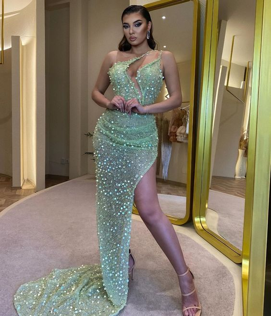 Green Satin Sweetheart Neck Beaded Mermaid Slit Prom Dress Evening Dress nv1411