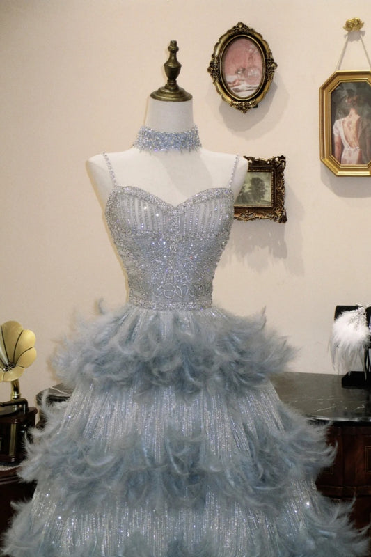 Light Blue Grey Sequin Feather Halter High Neck Ball Gown Evening Dress NV6551