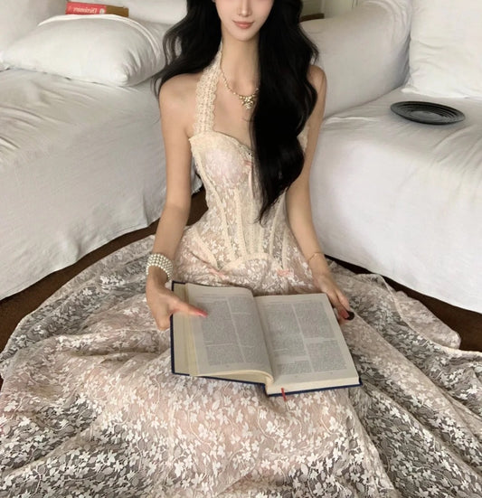 French Soft Flower Halter Lace Maxi Evening Dress NV6572
