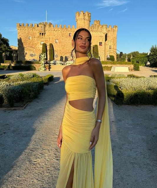 Yellow fashion simple elegant one-sleeve pleated long formal prom dress evening dress party dress nv2531