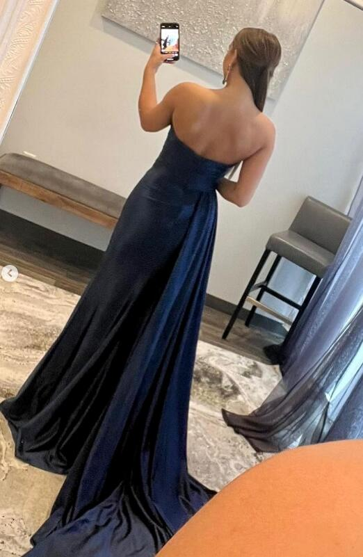 Strapless Navy Blue Lace Long Prom Dresses Evening Dresses with Pocket nv1558