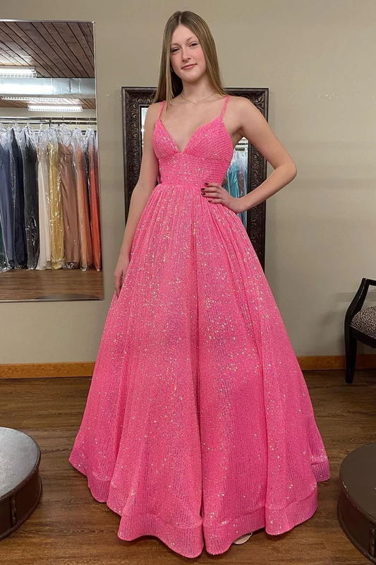 Champagne Shiny Sequins Simple Elegant Spaghetti Strap Long Ball Gown Evening Dress Party Dress nv2482