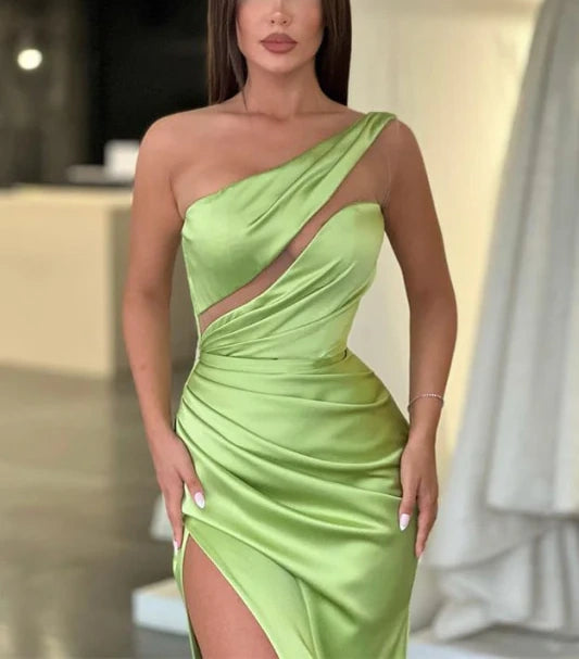 One Shoulder Satin Slim Mermaid Prom Dress with Side Sweep Train nv982