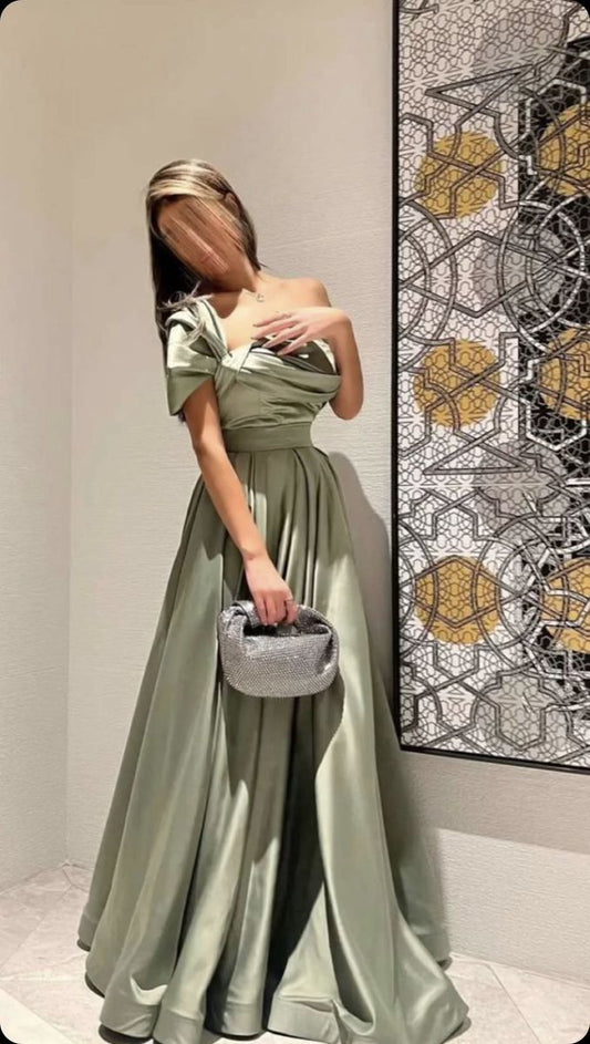 Green A-line elegant short sleeve off-shoulder satin pleated dress formal floor-length ball gown evening gown party dress nv2466
