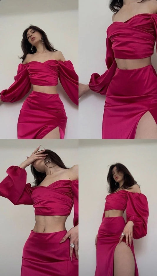 Fuchsia Vintage Two Piece Long Slit Prom Dress Satin Long Party Dress Birthday Outfit nv2029