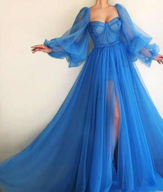 Blue gorgeous shiny elegant applique long tulle ball gown evening gown graduation dress nv55