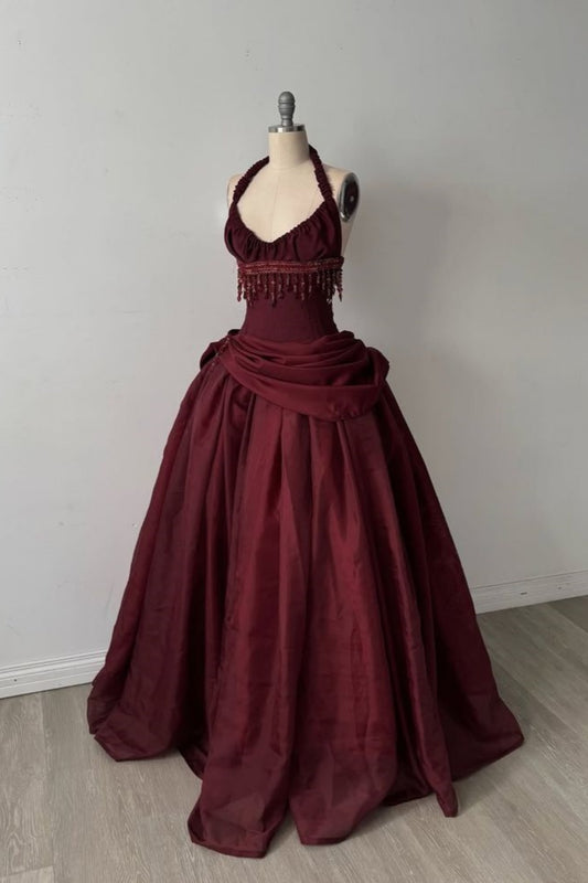 Halter Sleeveless Burgundy Satin Maxi Dress | Luxury Elegant Tassel Waist Ball Gown for Gala Ball NV6299
