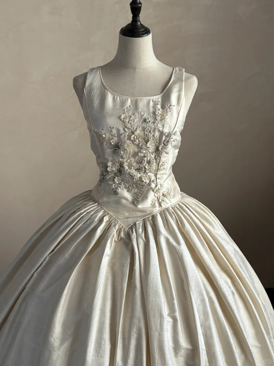 Ivory White Floral Beaded Long Satin Ball Gown Evening Gown Wedding Dress nv4439
