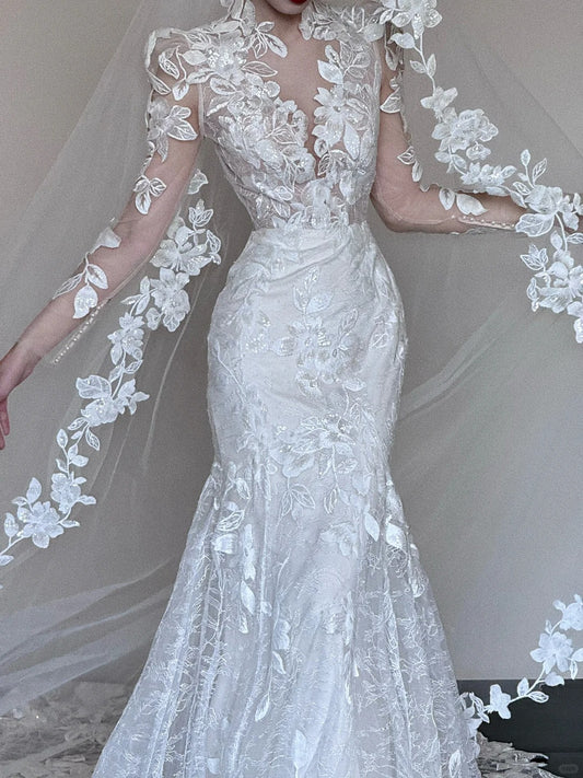 White Fashionable Gorgeous Elegant Exquisite Lace Long Mermaid Floor-length Tail Ball Dress Evening Dress Wedding Dress nv4056
