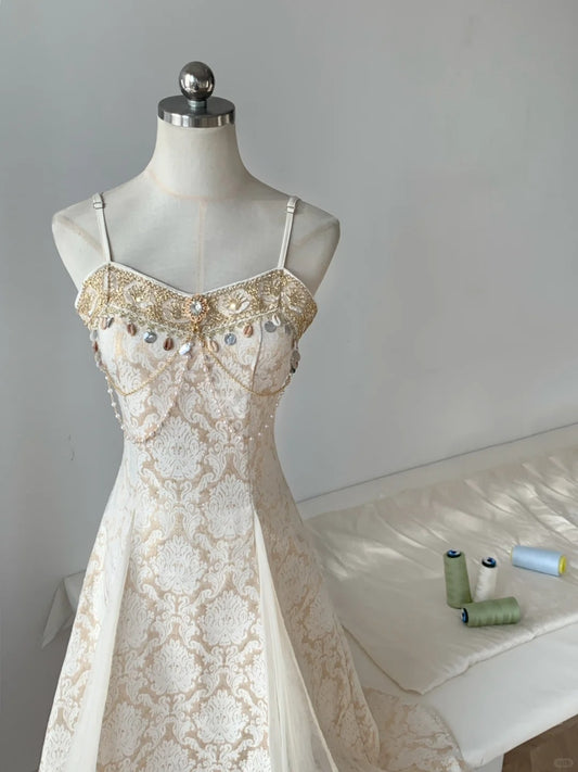 Champagner Retro Streamer schönes Palast-Stil Geburtstagskleid Locke Perlenbrosche Spaghettiträger langes Chiffon Ballkleid Abendkleid Partykleid nv4114