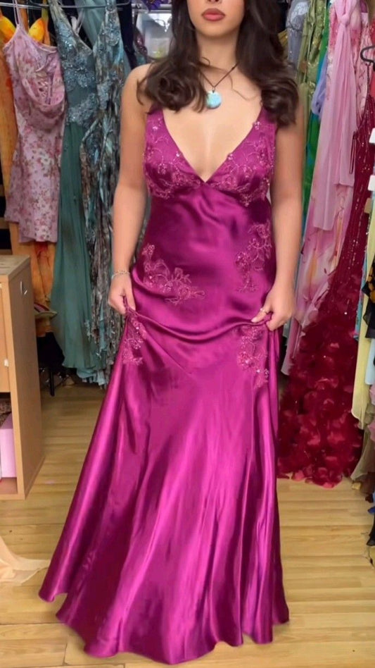 Lila Elegantes Einfaches V-Ausschnitt Tiefer Ausschnitt Spitze Langes Ballkleid Abendkleid Hochzeitsgastkleid nv2814
