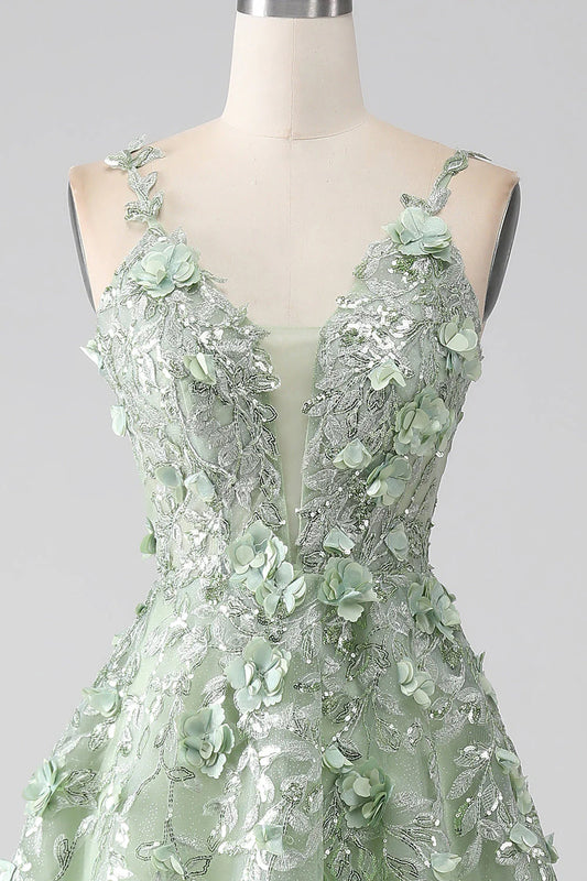 Salbeigrünes A-Linien-Ballkleid mit langem Korsett und Applikationen, nv1595