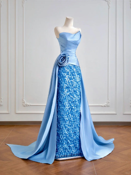 Blaues, glänzendes, langes, bodenlanges Satin-Ballkleid mit Pailletten, Abendkleid, Abschlusskleid, NV5104