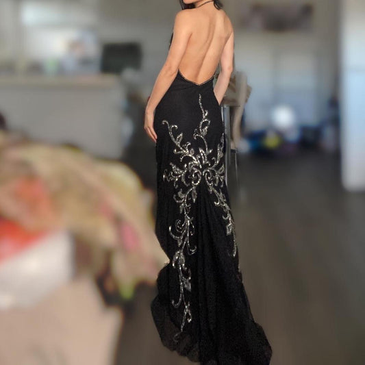 Schwarzes atemberaubendes Vintage-Mode-Kleid mit exquisitem Perlen- und geometrischem Muster, Neckholder, langes Chiffon-Tüll-Ballkleid, Abendkleid, Partykleid, NV3809