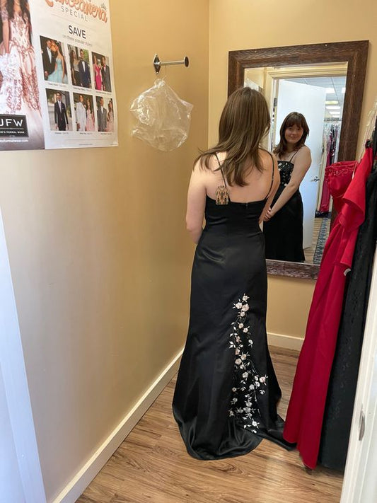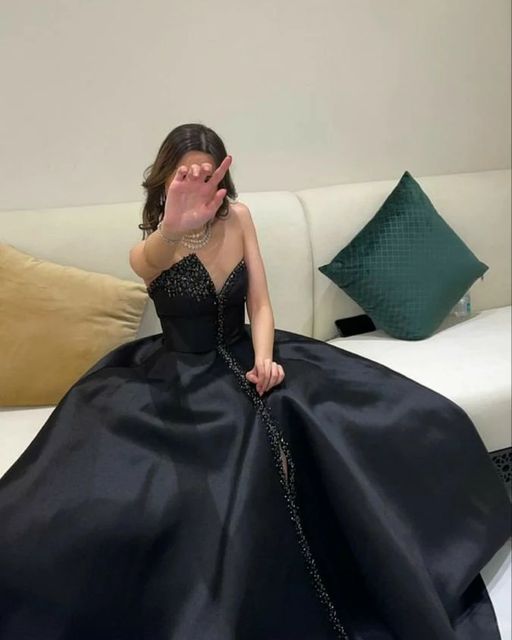 Atemberaubendes langes Ballkleid aus schwarzem Vintage-Satin mit rosa Blumenperlen, wunderschönes schulterfreies Abendkleid, Partykleid nv2749