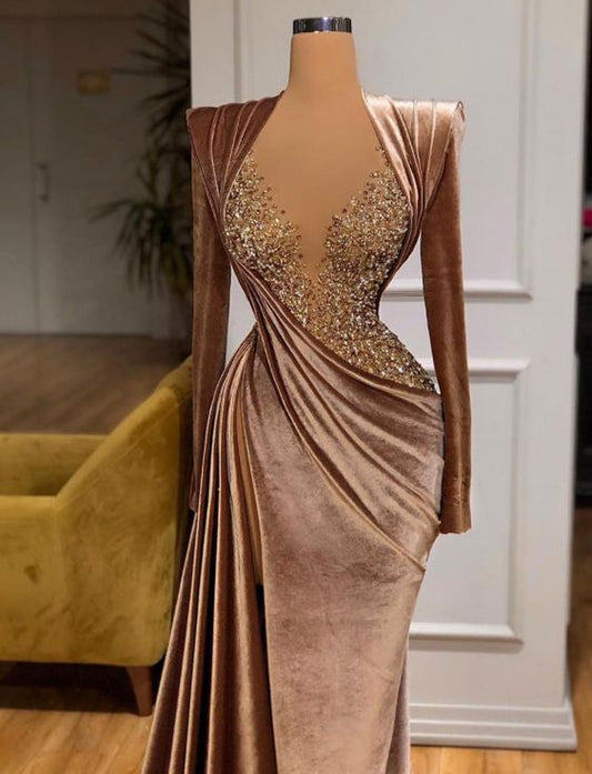 Braun Sexy Samt Perlen Meerjungfrau Slim Fit Langarm Lange Herbst Winter Ballkleid Abendkleid nv2634
