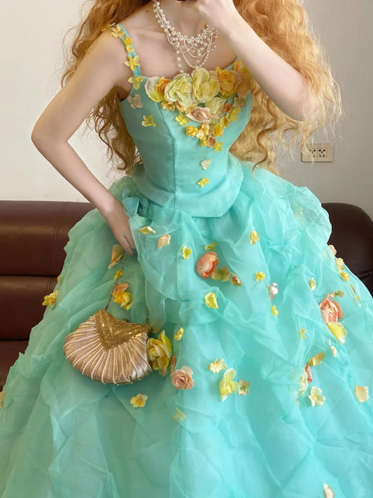 Mintgrünes, langes Vintage-Ballkleid aus Tüll mit Blumenmuster, nv5037