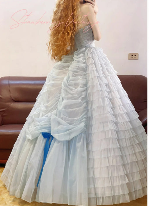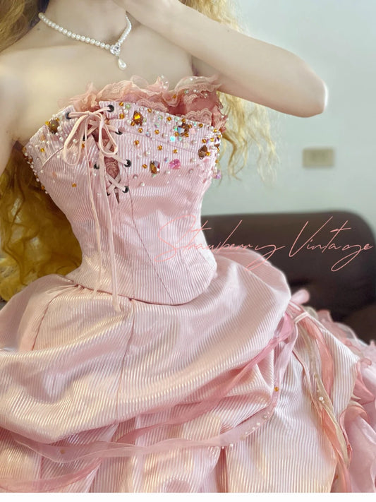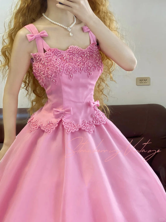 Rosa Spitze Schleife Vintage Elegante Lange Mehrlagige Prinzessin Tüll Ballkleid nv5027