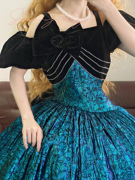 Blaues, florales Vintage-Ballkleid mit elegantem, langem Prinzessinnen-Tüll, nv5026