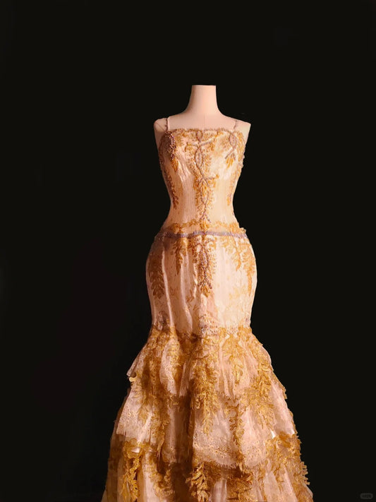Goldenes wunderschönes exquisites Spitzen-Spaghettiträger-langes Tüll-Bodenlang-Schleppe-Ballkleid-Abendkleid-Abschlussballkleid nv3901