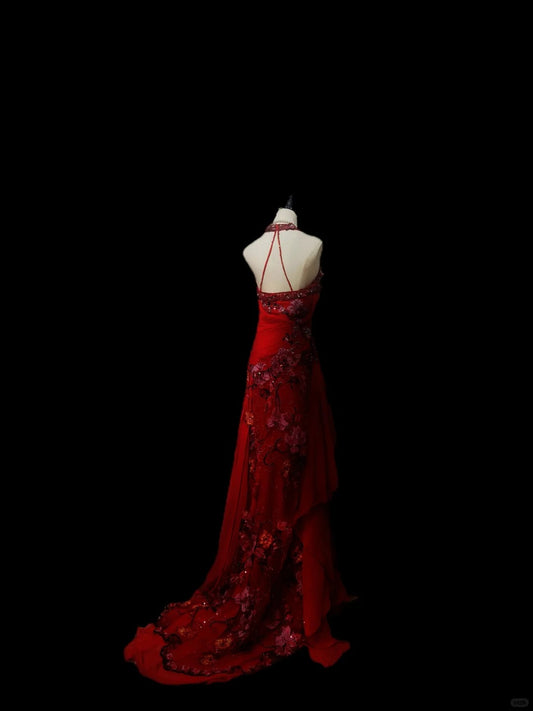 Wunderschönes, rotes, Retro-Mode-Abendkleid mit exquisiten Perlen und langem Satin-Bodenlang nv3917