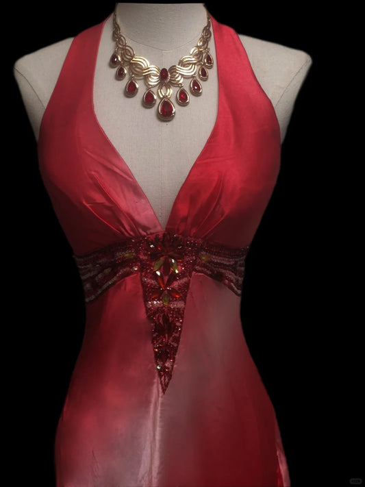 Wunderschönes Vintage-Kleid mit exquisiten Edelsteinen und Perlen, Neckholder, lang, Meerjungfrau-Stil, schmal, bodenlang, Satin, Ballkleid, Abendkleid, Partykleid, nv3946