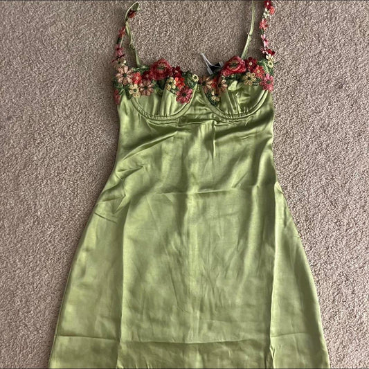Grünes kurzes Satin-Heimkehrkleid mit Blumenmuster, Partykleid, nv4756