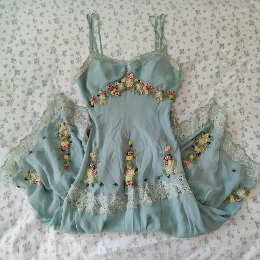 Grünes Vintage-Blumen-Kurz-Chiffon-Heimkehrkleid nv4475
