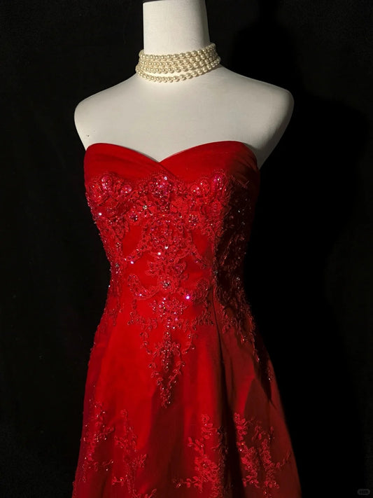 Elegantes, langes Ballkleid-Abendkleid aus rotem, perlenbesetztem Tüll, NV4782