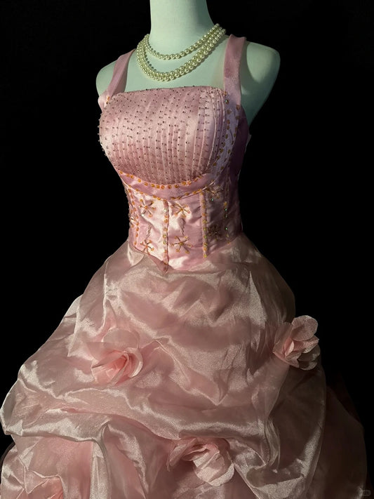 Rosa Perlenbesetztes, florales, elegantes, langes Ballkleid aus Tüll, nv4783