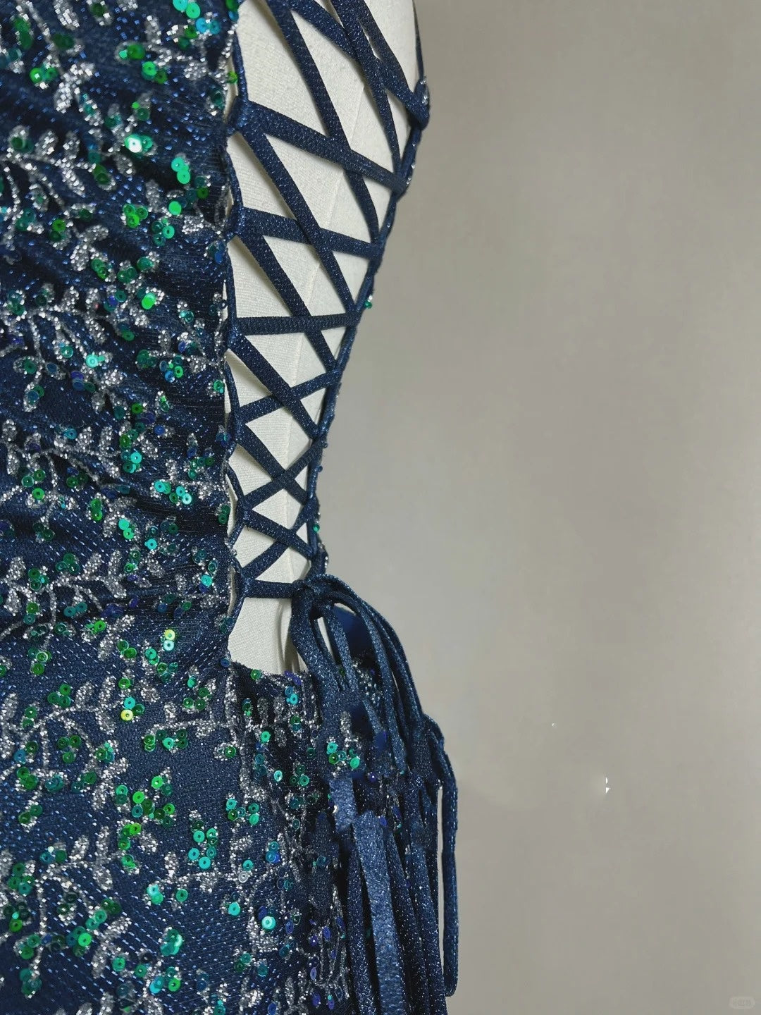 Blaues, florales, perlenbesetztes, kurzes Satin-Heimkehrkleid, Geburtstagskleid, NV4489