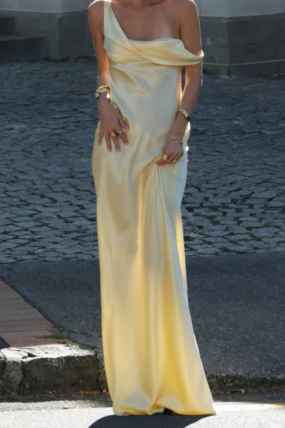 Elegantes, hellgelbes A-Linien-Träger-Satin-Langballkleid, Abendkleid nv5393