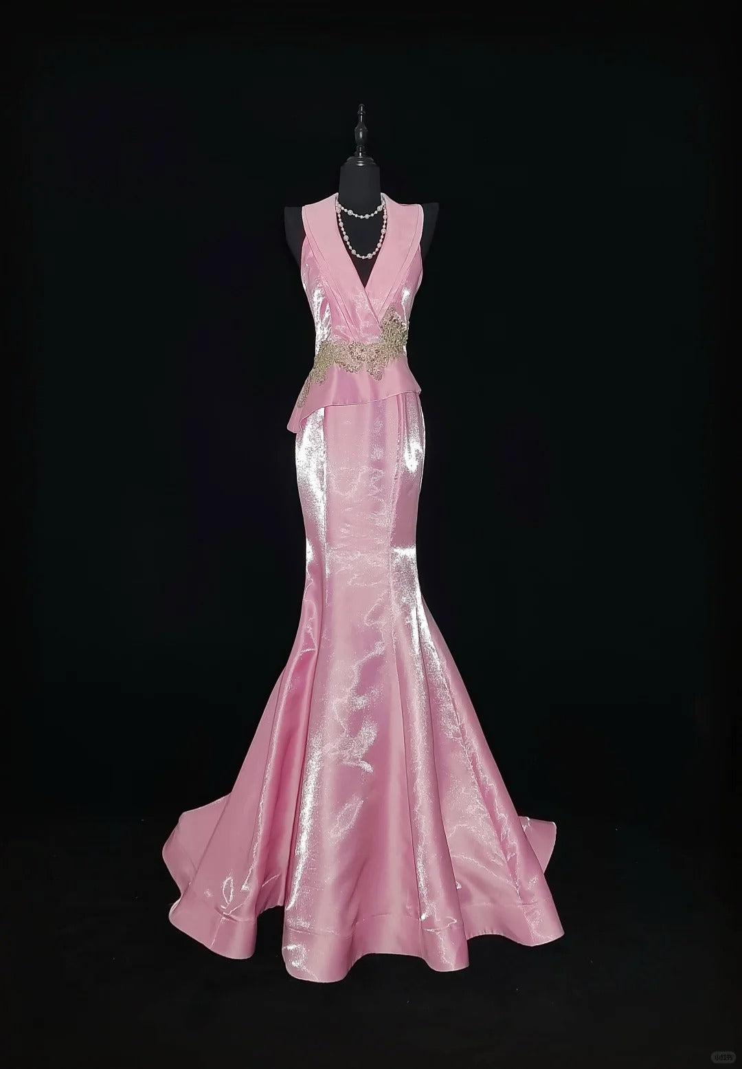 Rosa Elegante Mode Exquisite Perlen Lange Satin Meerjungfrau Schlank Bodenlangen Schleppe Ballkleid Abendkleid Ballkleid nv3870