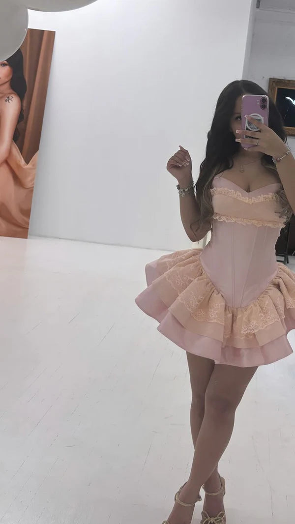 Rosa Mode Satin Spitze Kurzes Homecoming Kleid Geburtstag Party Kleid nv4695