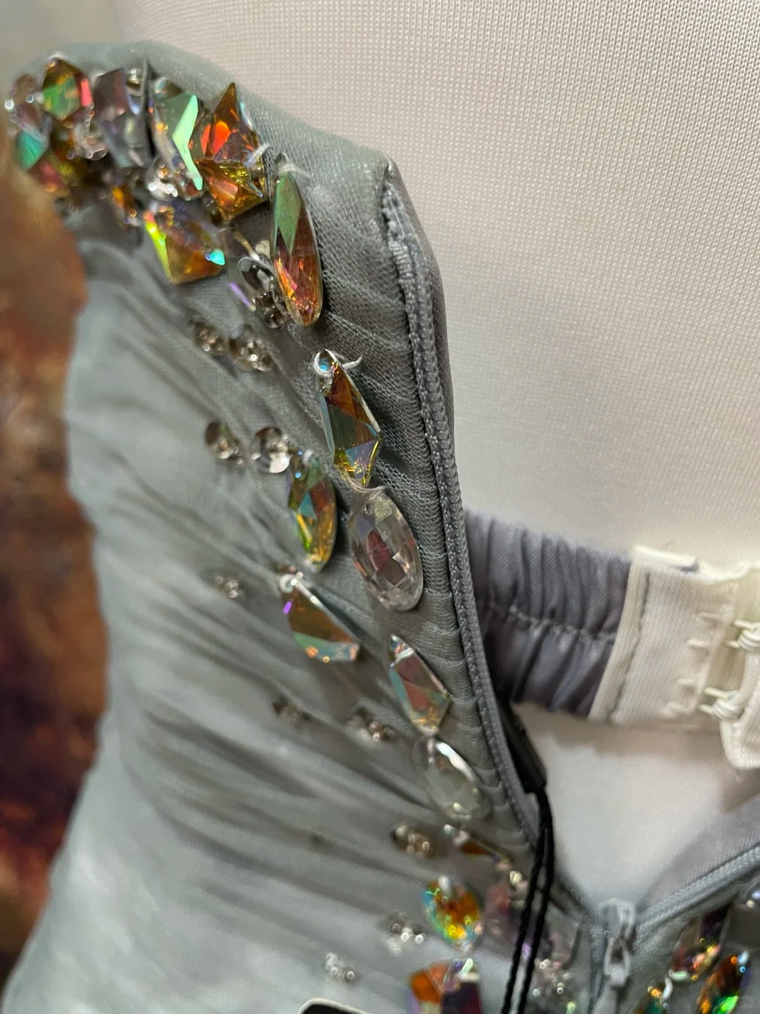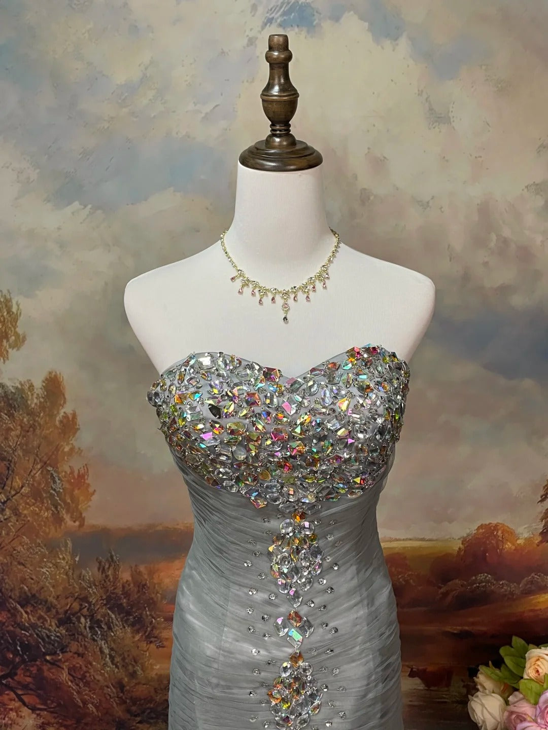 Silbergrau Vintage Elegant Exquisite Edelstein Perlen Langes Tüll Ballkleid Abendkleid Ballkleid nv4079