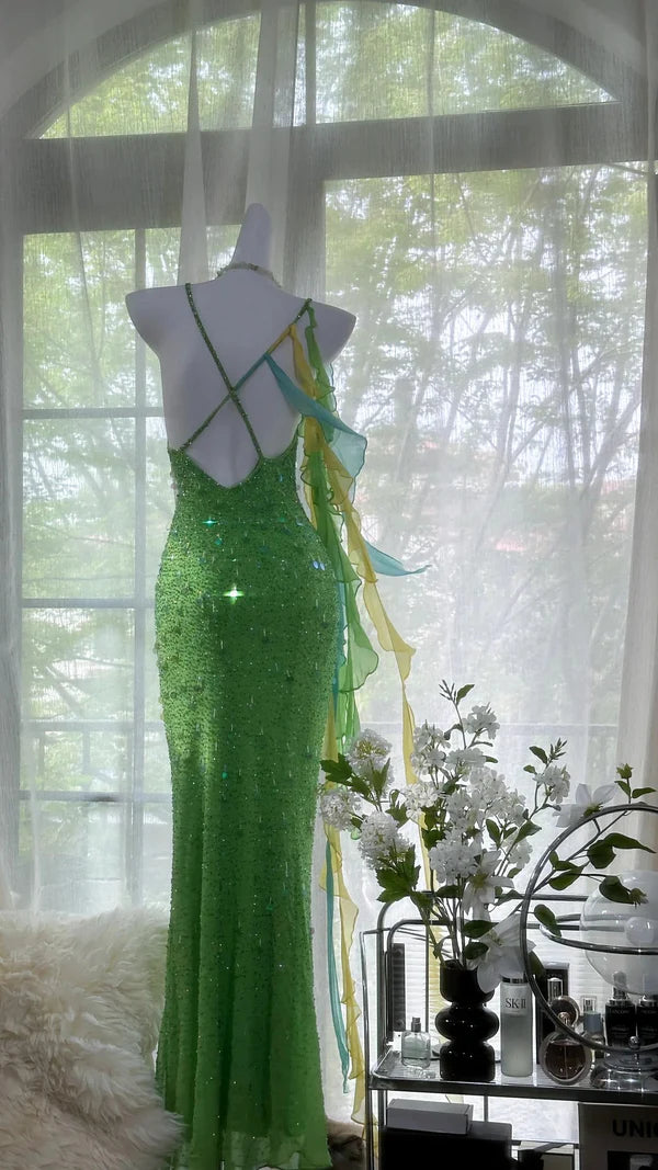 Vintage Abendkleider, Grüne Pailletten Meerjungfrau Ärmellose Lange Partykleider nv4331