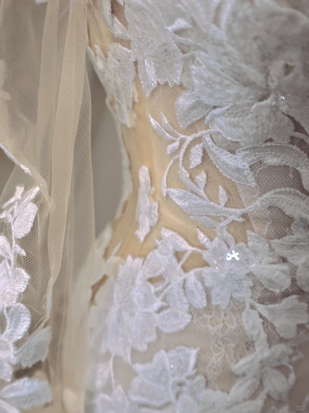 Weißes, florales Spitzenkleid mit Applikationen, langen Ärmeln, Meerjungfrau-Stil, schmale Passform, bodenlanges Ballkleid, Abendkleid, Brautkleid, NV4435
