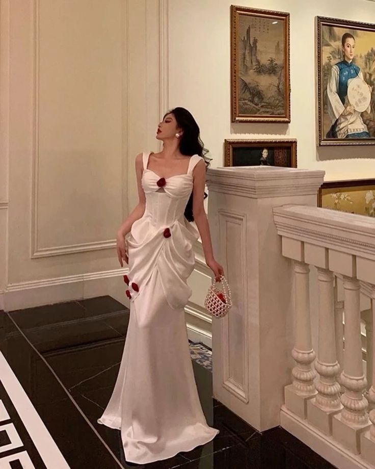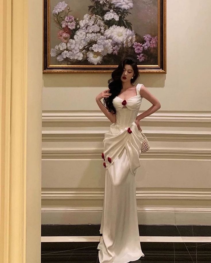 Weißes, mit roten Rosen verziertes Satin-Langballkleid, Partykleid, Abendkleid nv2319
