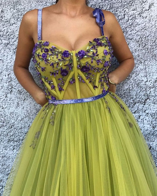 Yellow shiny delicate beaded spaghetti straps elegant long tulle ball gown evening dress party dress nv3536