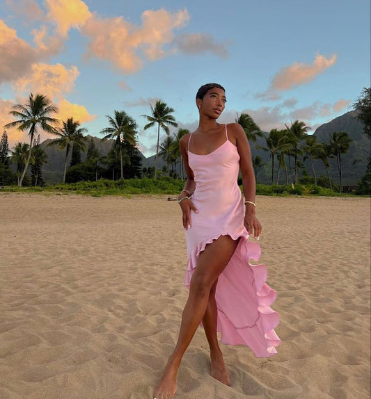 Pink Fashion Elegant Spaghetti Strap Long Satin Ruffle Ball Gown Evening Dress Holiday Party Dress nv3494
