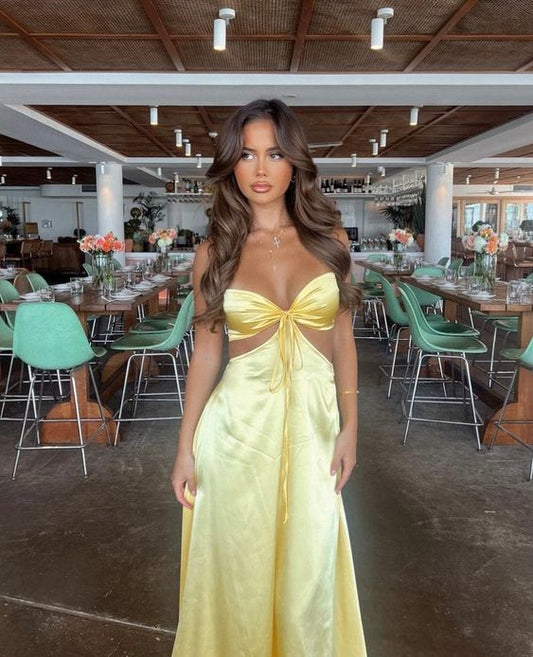 Yellow Elegant Off Shoulder Strapless A-Line Long Satin Formal Prom Dress Evening Gown Wedding Guest Dress nv2779