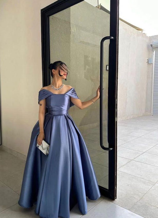 Blue A-line simple elegant satin off-shoulder long ball gown party dress evening dress nv2510
