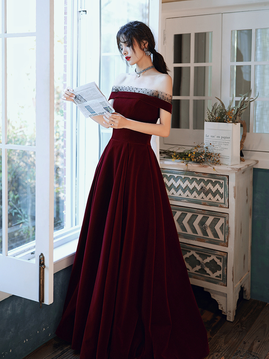 Elegant Wine Red Velvet Off Shoulder Long Prom Dress, Dark Red Long Evening Party Dress nv585