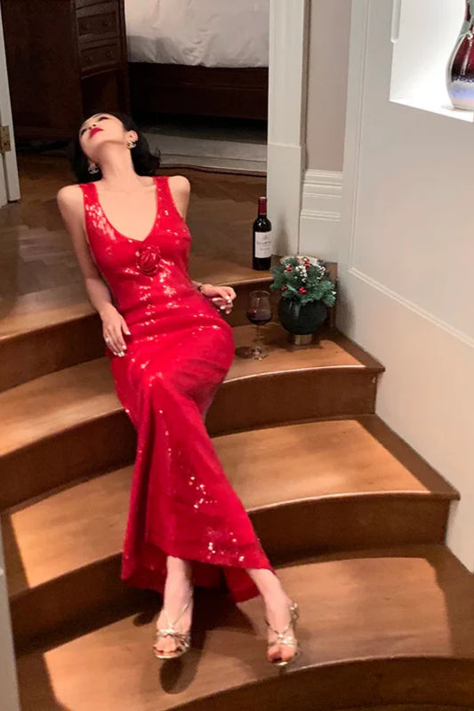 Charming Red Mermaid Halter Sequin Open Back Prom Dress Evening Dress nv5394