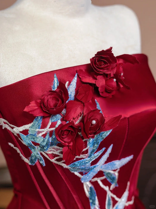 Red floral pleated fashionable long satin princess ball gown nv5045