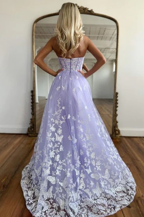 Lilac Tulle 3D Floral Lace A-Line Prom Gown with Slit nv833
