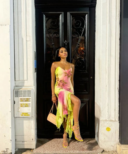 Pink Green Spaghetti Strap Beaded Tassel Long Ball Gown nv2905